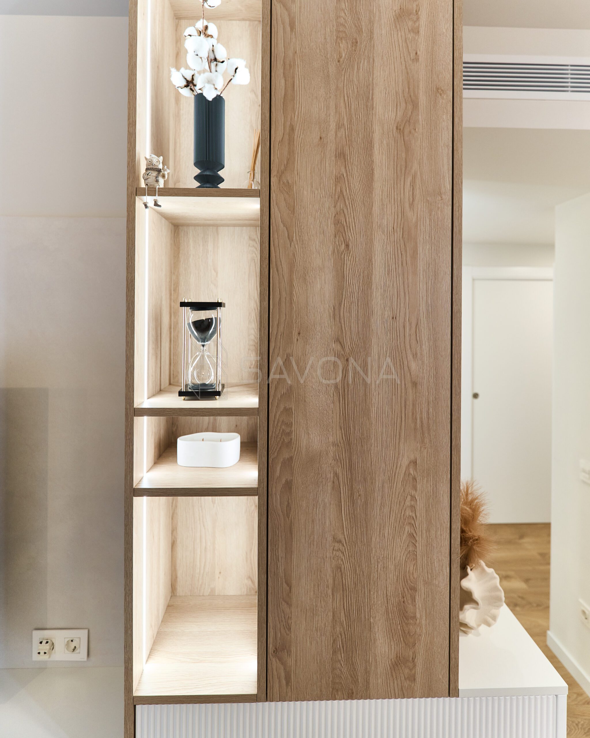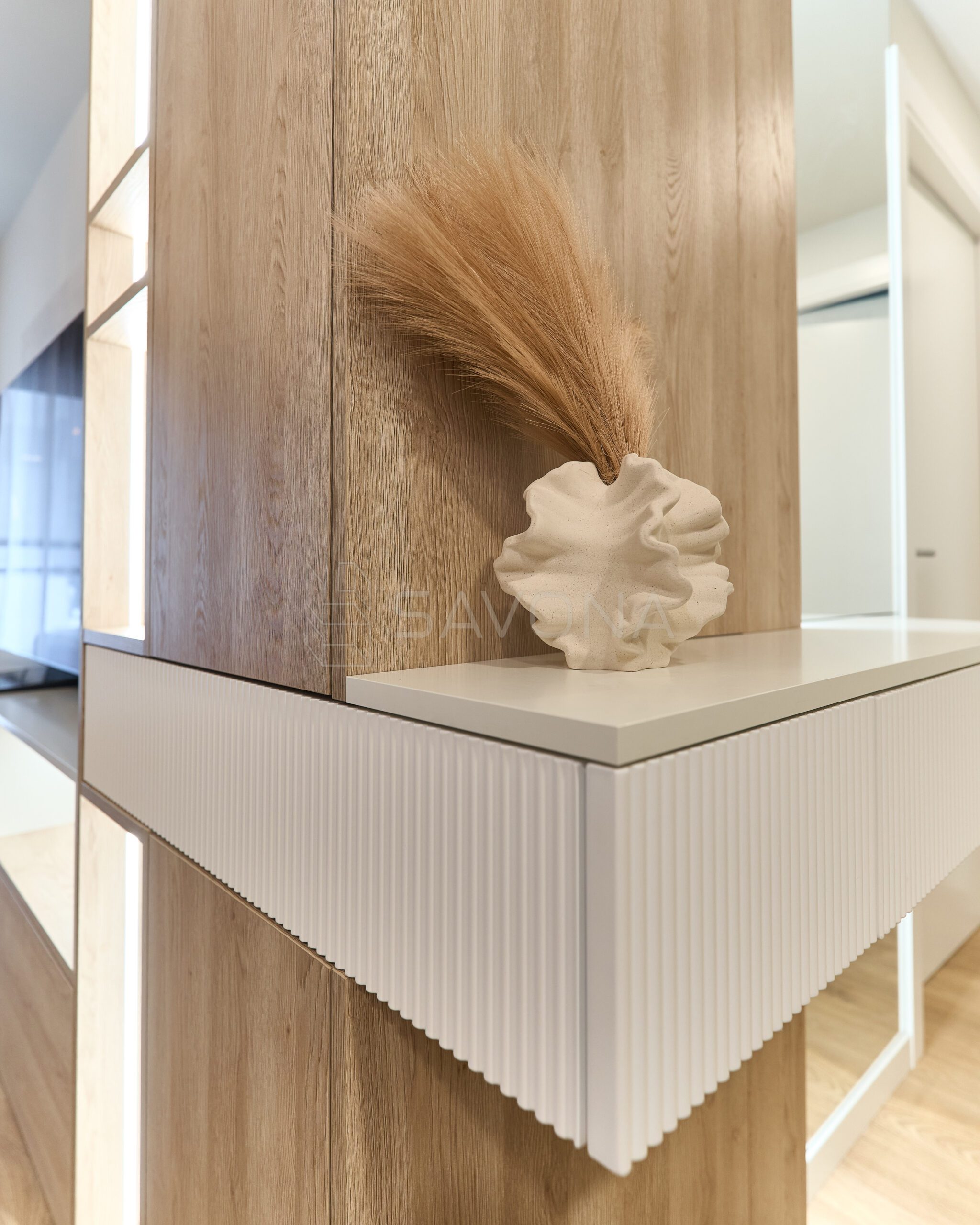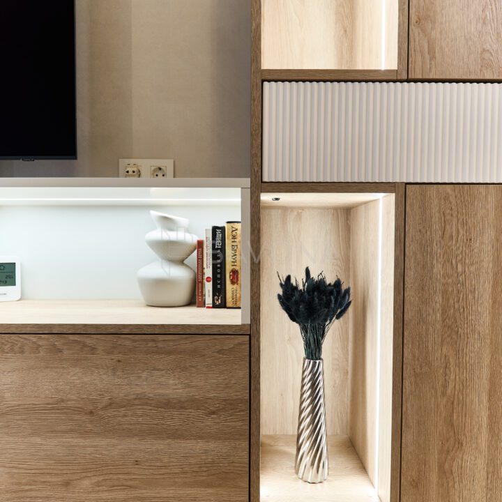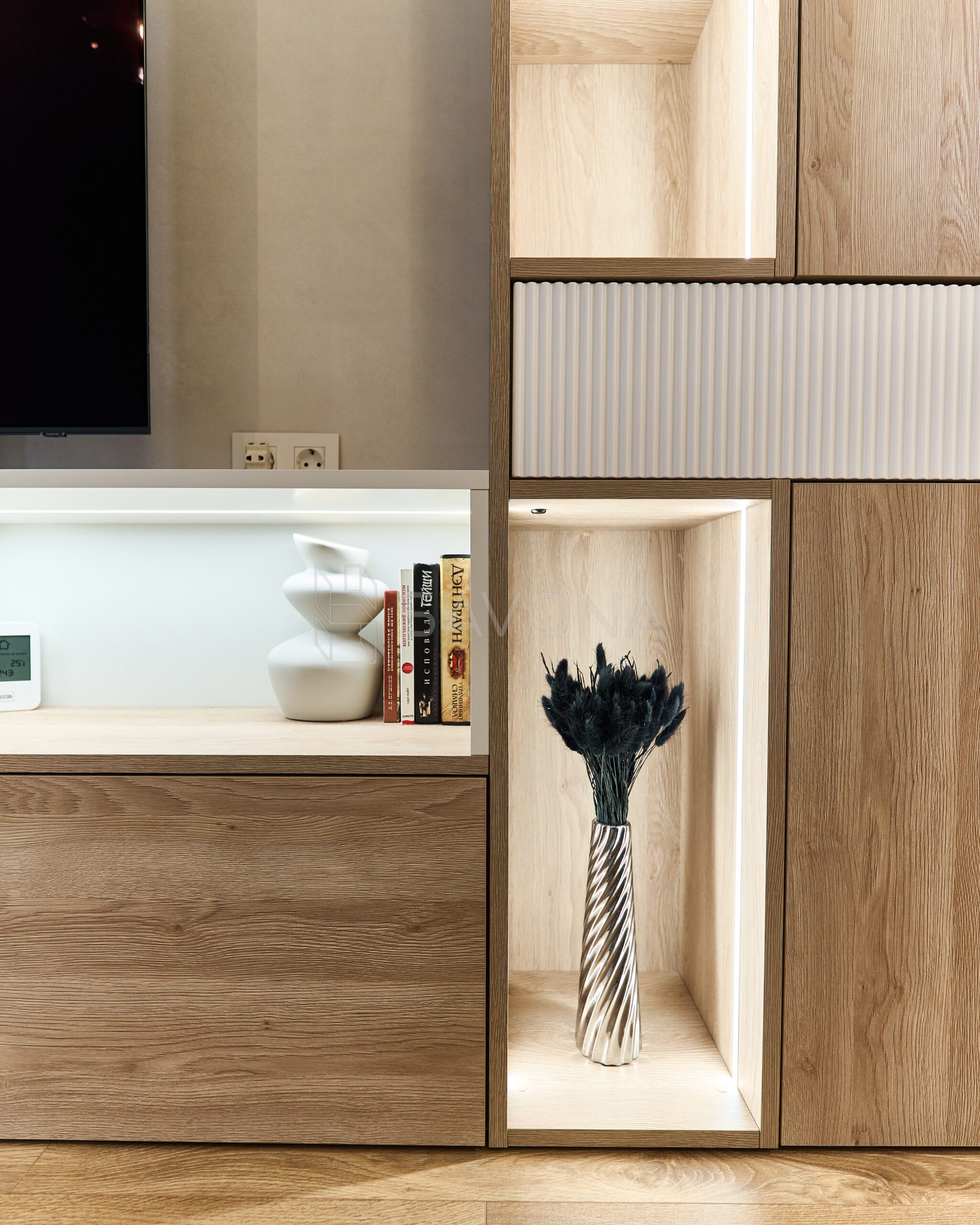 El cálido tono de roble natural se combina armoniosamente con detalles blancos y paneles decorativos con relieve. La iluminación en los nichos resalta las formas y crea un ambiente acogedor, mientras que la ergonomía bien pensada garantiza comodidad en el uso. Una solución perfecta para el salón que aportará estilo y confort al interior.