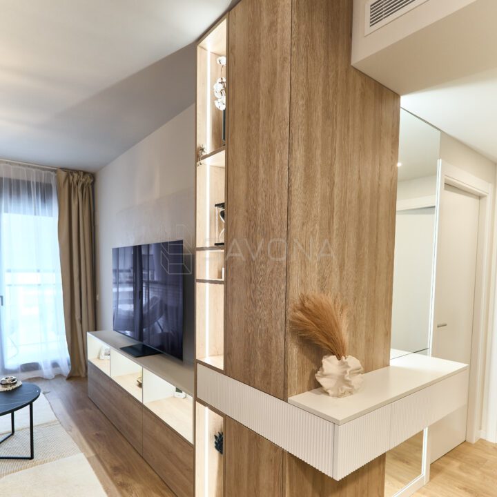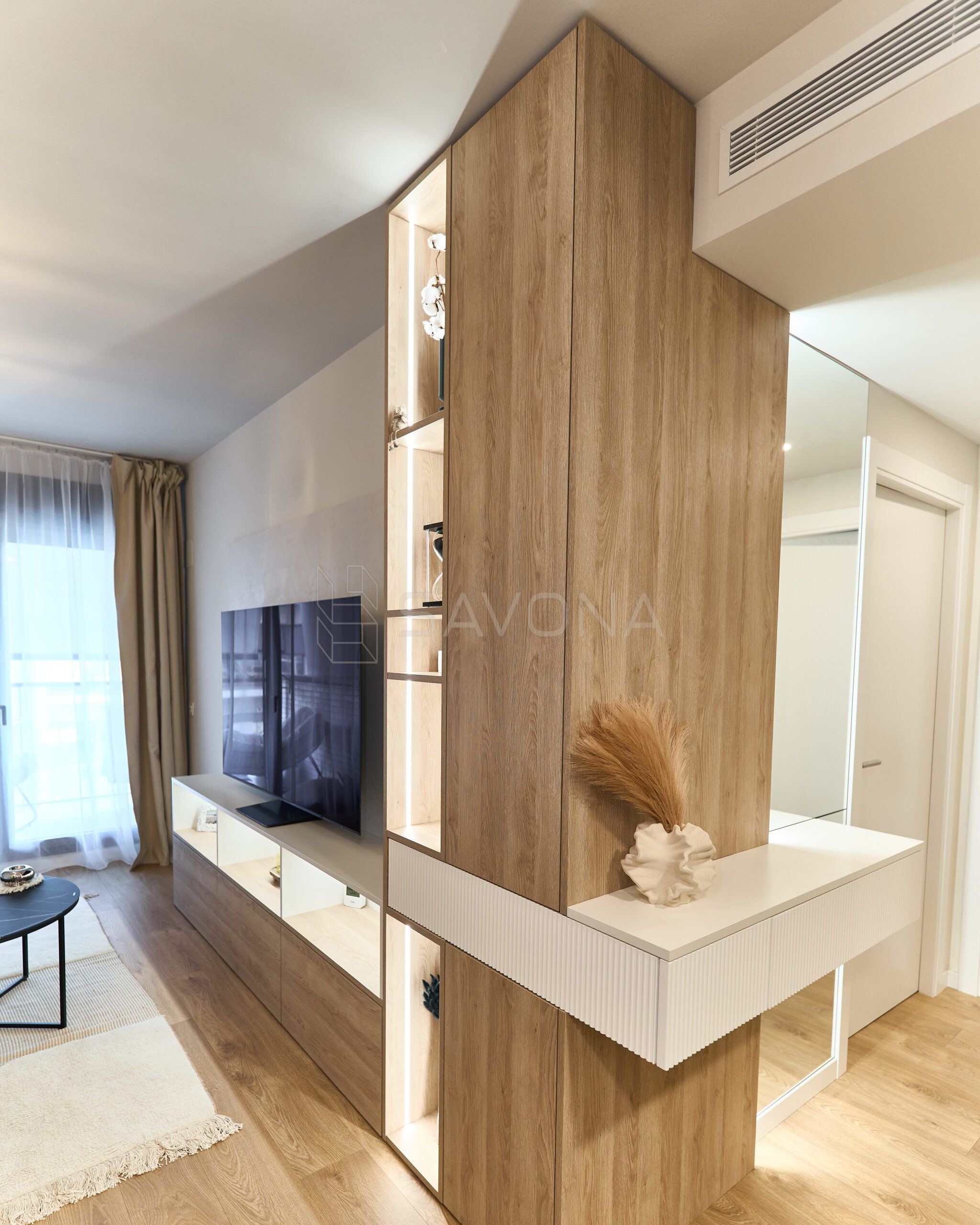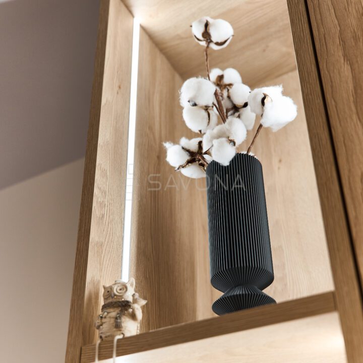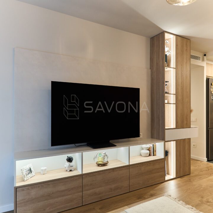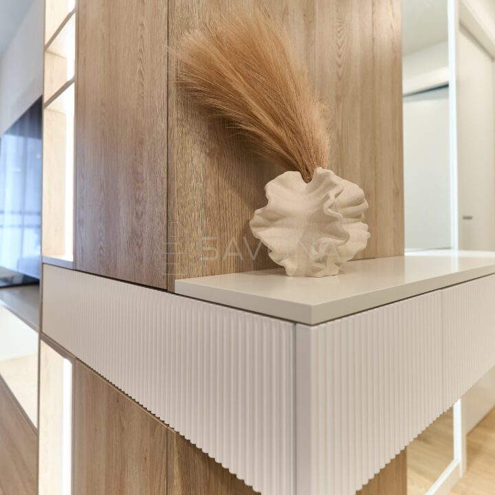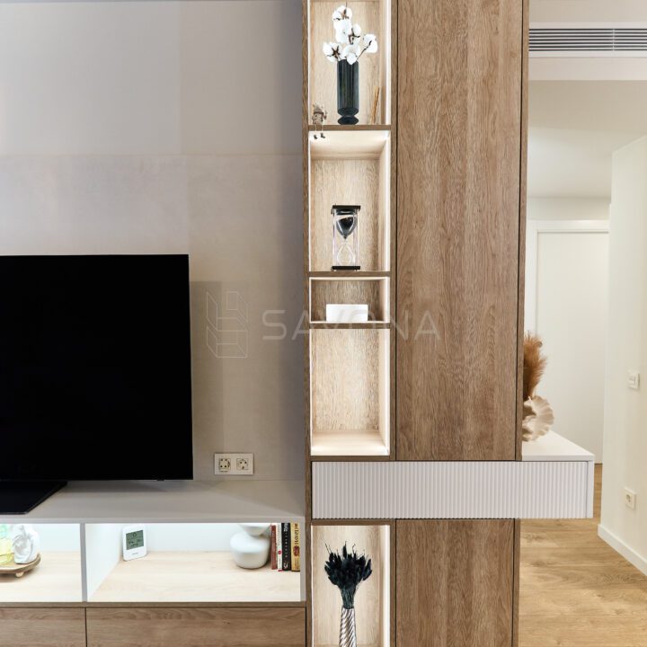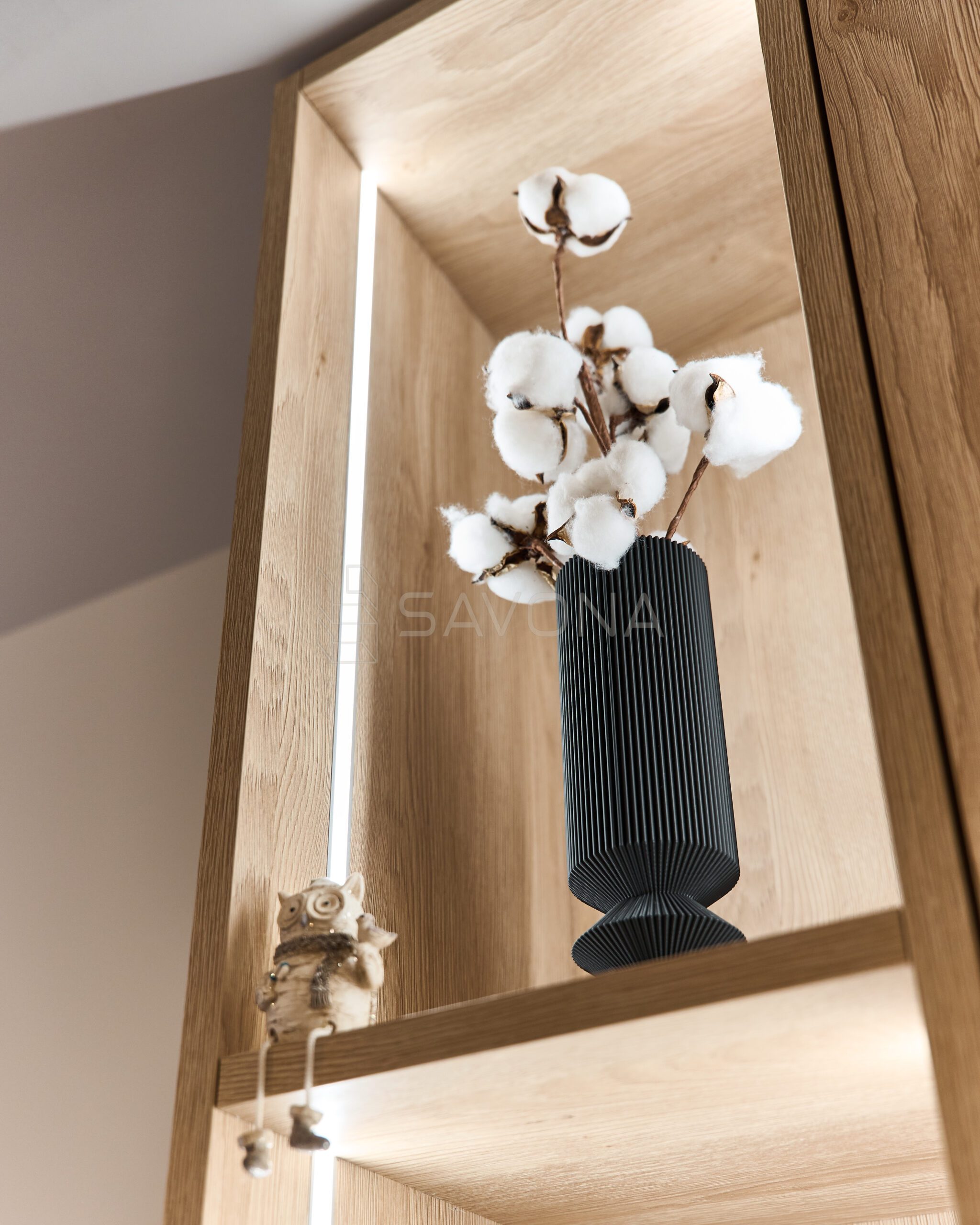 El cálido tono de roble natural se combina armoniosamente con detalles blancos y paneles decorativos con relieve. La iluminación en los nichos resalta las formas y crea un ambiente acogedor, mientras que la ergonomía bien pensada garantiza comodidad en el uso. Una solución perfecta para el salón que aportará estilo y confort al interior.