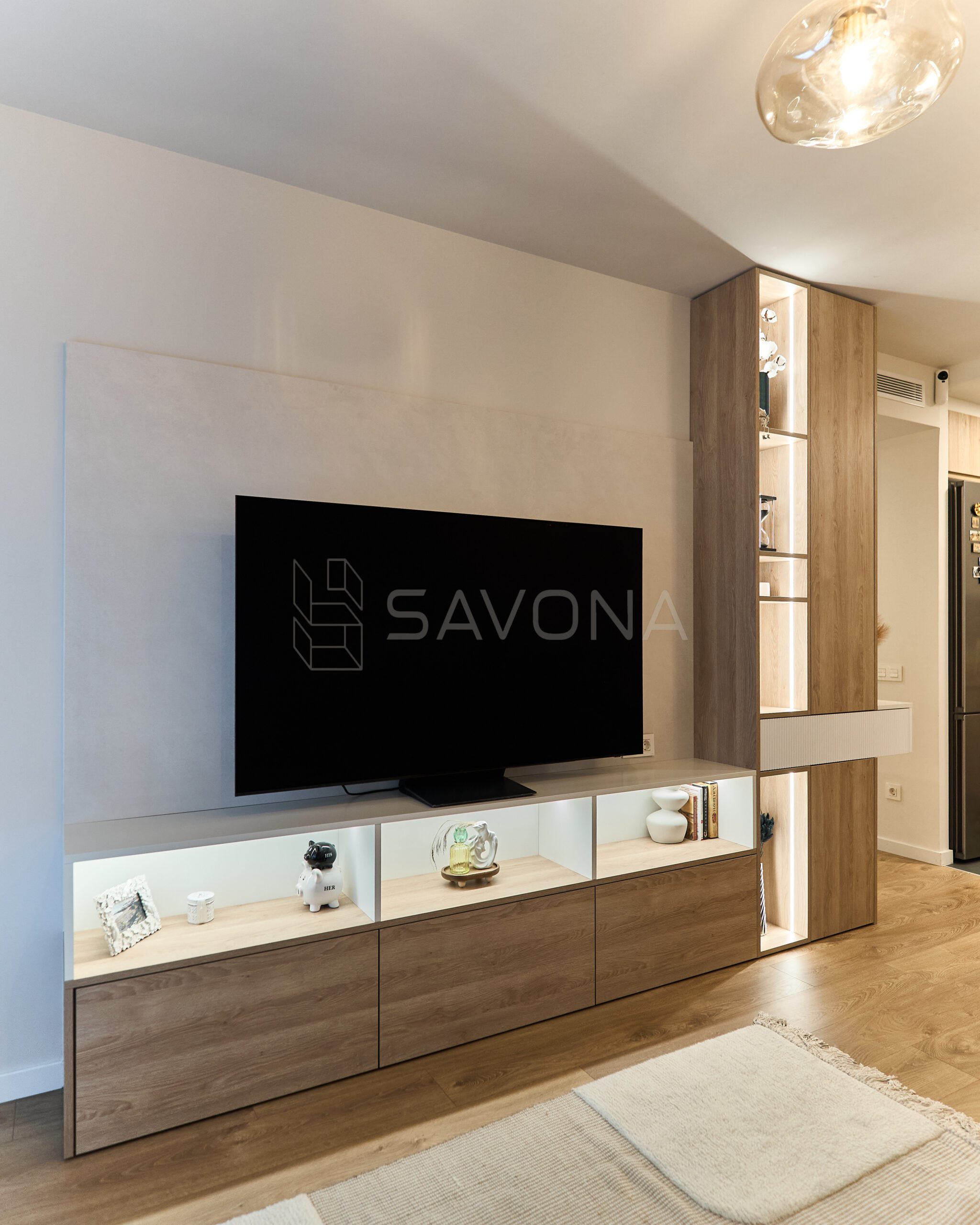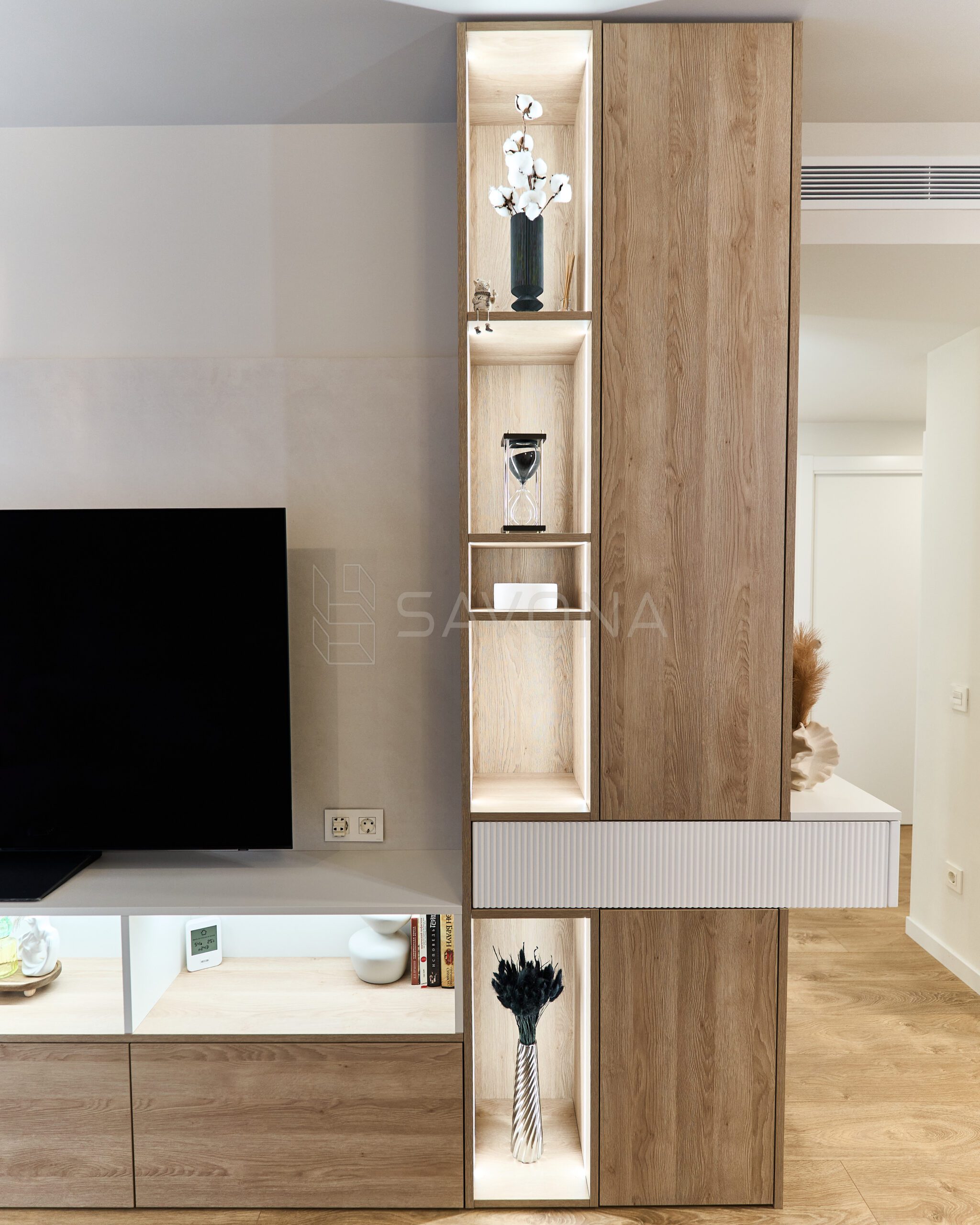 Elegante conjunto de muebles en estilo contemporáneo que combina funcionalidad y estética. La composición incluye un amplio mueble bajo para TV con cajones cerrados para almacenamiento, nichos abiertos con iluminación para elementos decorativos y un módulo vertical con estantes tipo vitrina.